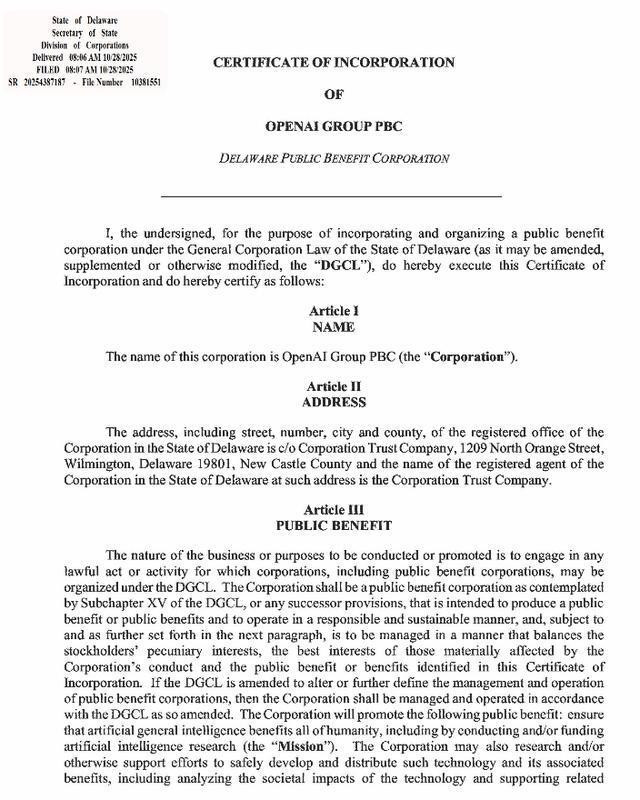 2025年10月28日,OpenAI的PBC公司章程首页截图